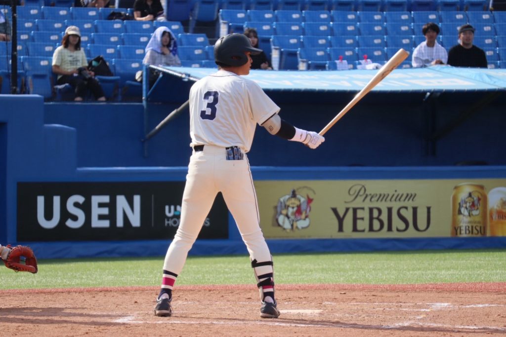 飯田真渚斗(4年/明秀日立)が相手打線を完璧に抑え、続く裏の攻撃。